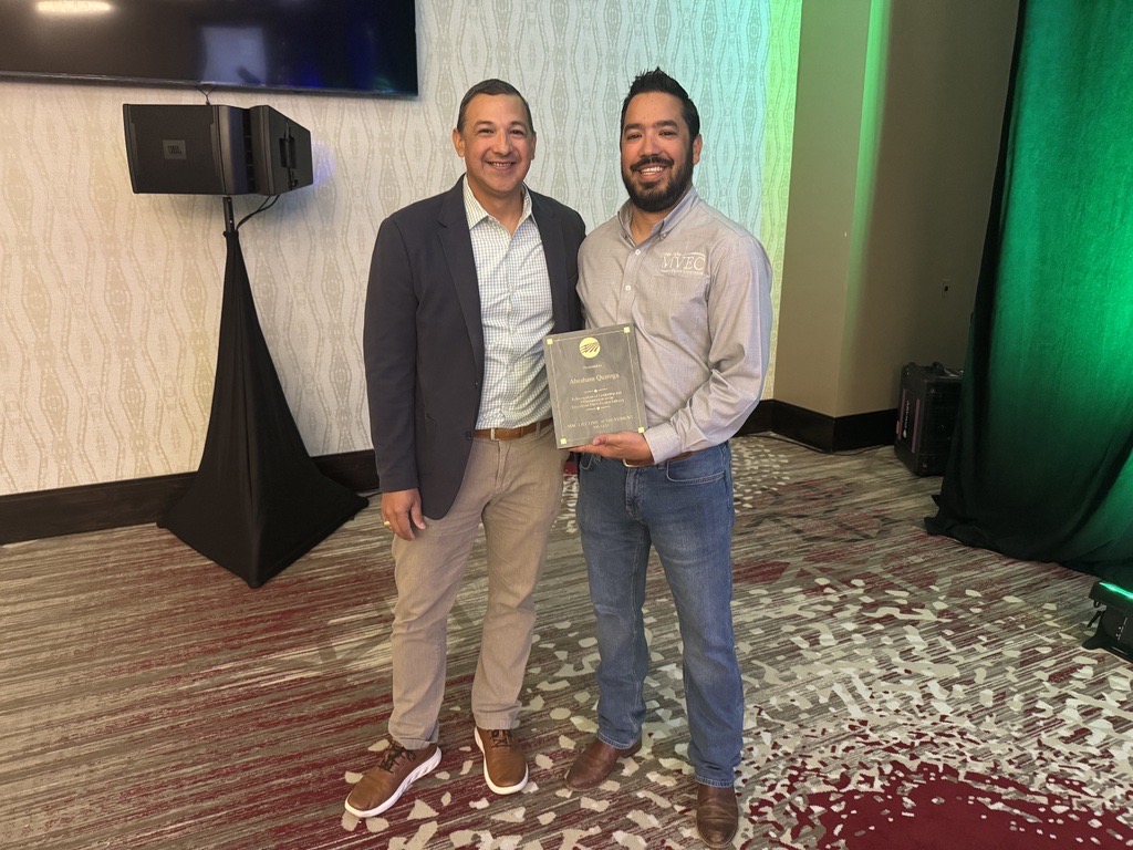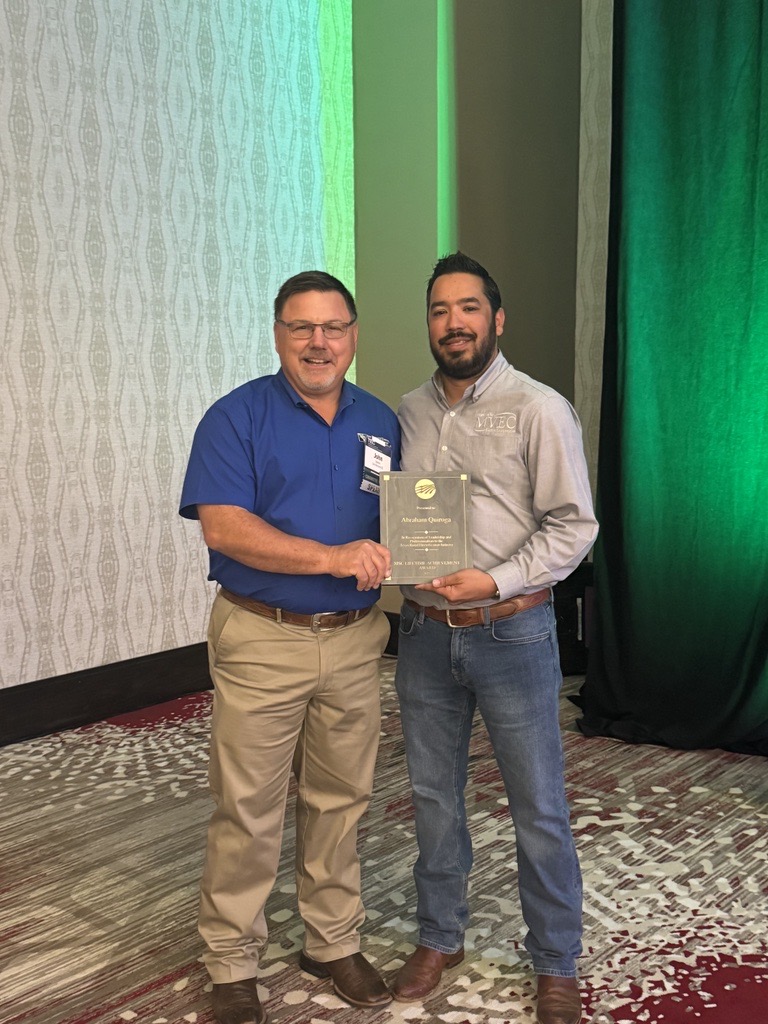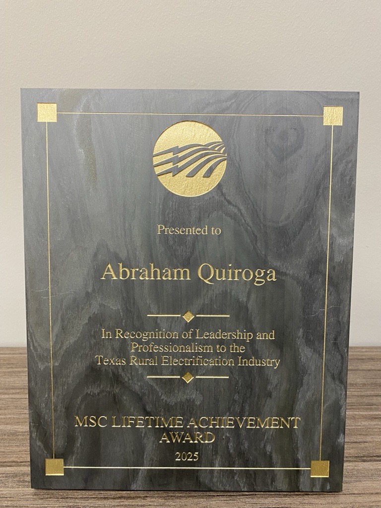 Abraham Quiroga, a highly respected leader among Texas electric cooperatives, was recently honored with the TEC Member Services Conference Lifetime Achievement Award in recognition of his exceptional career and devoted commitment to the cooperative mission. The prestigious award was presented by Atanacio “Tachi” Hinojosa, General Manager of Central Texas Electric Cooperative, who previously worked for MVEC before accepting his current GM position.